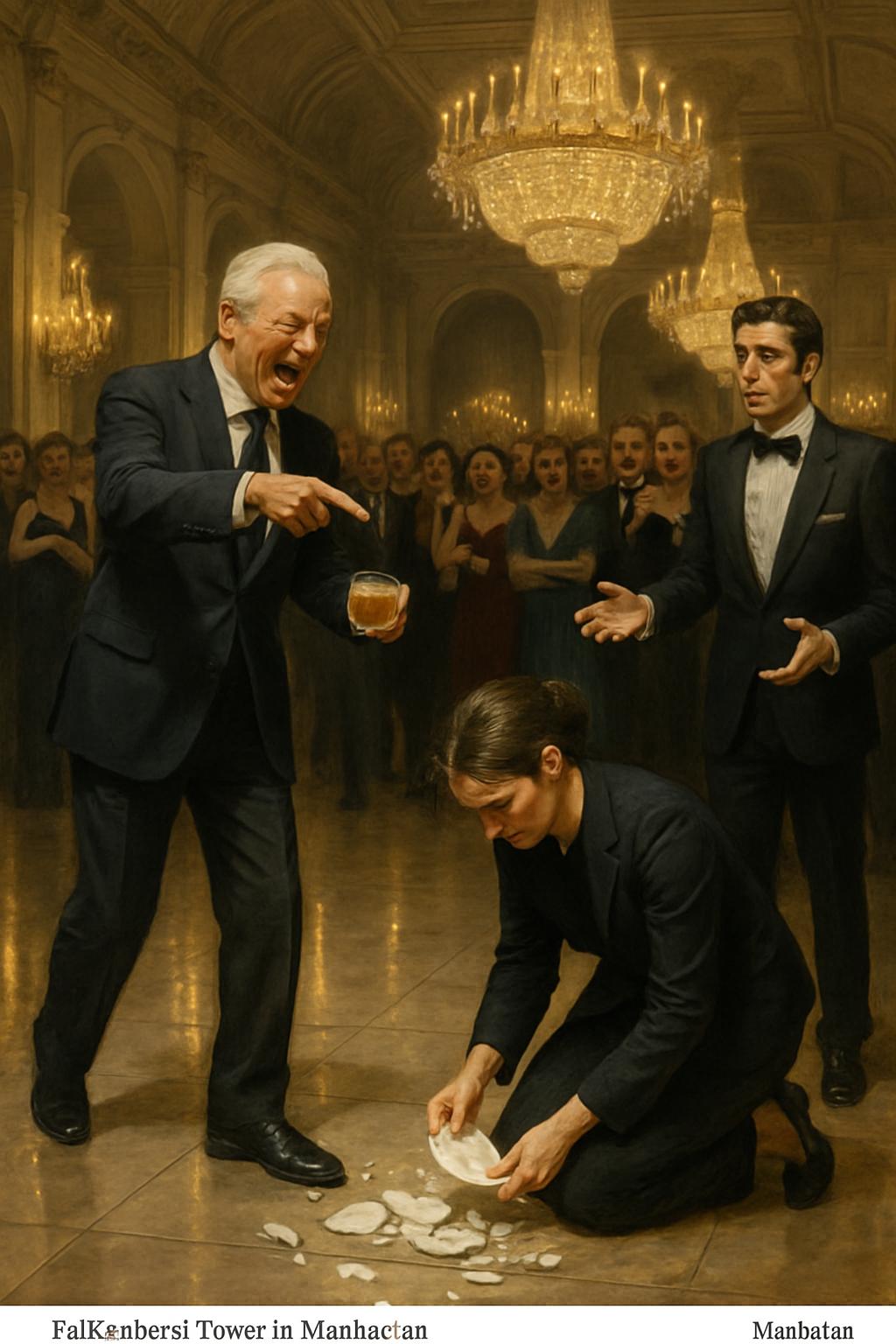 Ein falscher Schritt, ein leises Einatmen — dann zerschnitt das Klirren von zerbrechendem Porzellan die Musik. Stille breitete sich aus, während Clara auf die Knie sank und mit zitternden Fingern die Scherben aufsammelte. Zweihundert Augenpaare ruhten auf ihr, gespannt, gierig nach dem nächsten Moment.