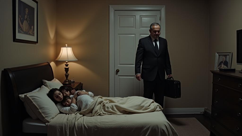 Mit festem Schritt betrat Dominik Heller sein Schlafzimmer. Die Reise steckte ihm noch in den Knochen; der Anzug wirkte zerknittert, seine Haltung angespannt. Ohne ein Wort ließ er die Aktentasche aus der Hand gleiten.