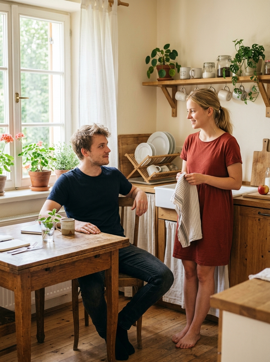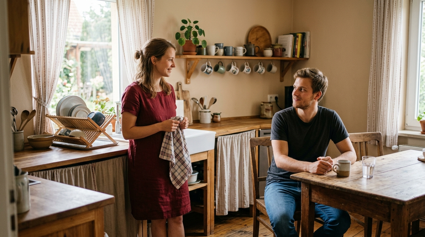 Doch an diesem Abend wirkte die Luft in der Küche schwerer als sonst. Lena machte keinen Schritt in Richtung Herd. Stattdessen blieb sie am Spülbecken stehen und betrachtete den Mann am Tisch schweigend.